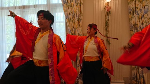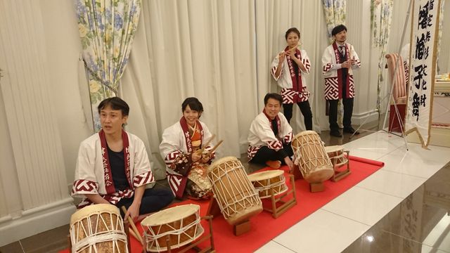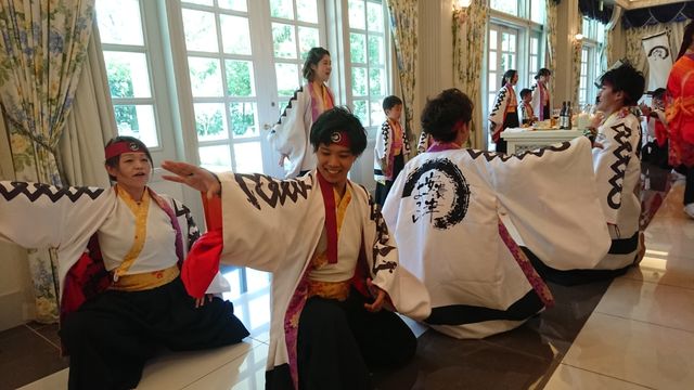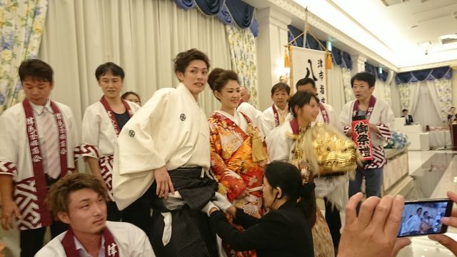 新郎和哉が所属する津市民芸保存会の皆さんも獅子舞でお祝い、新郎まで袴姿なのに獅子舞を舞いました😅暑かったから大変だったでしょう。また、新婦はよさこいチームでご活躍なので安濃津よさこい祭実行委員会の方々もたくさん、招待されていました。